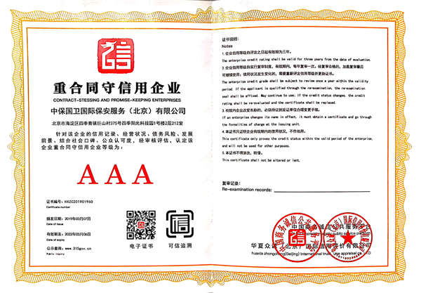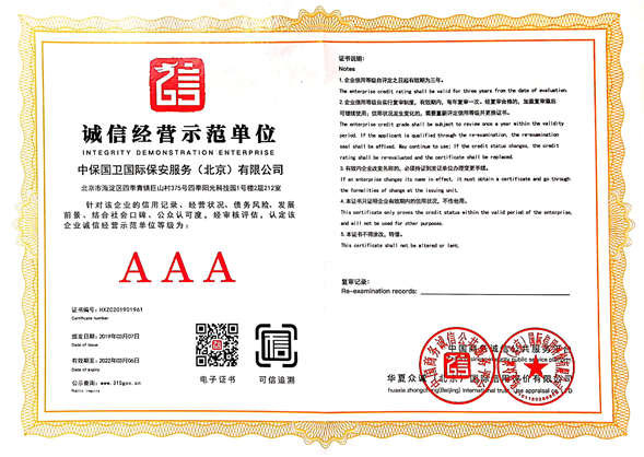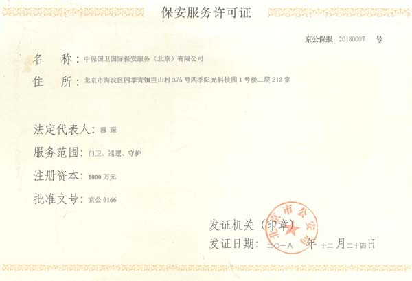 中保國衛(wèi)國際保安服務(北京)有限公司,屬中保國衛(wèi)集團旗下子公司。能全方位的為大型客戶提供優(yōu)質(zhì)的安保、押運服務,是集人防和技防于一體的新型正規(guī)化綜合安保押運服務企業(yè),提供人防、物防、技防、聯(lián)網(wǎng)報*、非武裝押運等安防相關(guān)的一站式服務。 公司在國內(nèi)多省設(shè)立有分公司及分支機構(gòu),著重提升安全押運、智能技術(shù)押運及安全技術(shù)防范相關(guān)的服務,業(yè)務范圍覆蓋全國一、二線城市、港澳地區(qū)以及海外地區(qū)。安保方面主要為政府機構(gòu)、金融機構(gòu)、企事業(yè)單位、醫(yī)療衛(wèi)生、高等院校、工業(yè)園區(qū)、大型商場、高檔住宅、智能商務樓、大型活動提供門衛(wèi)、守護、巡邏、押運(非武裝)、安全檢查、保安特勤、私人護衛(wèi)、消防中控、安全技術(shù)防范、遠洋護航等全方位服務,同時面向國際市場,為中資企業(yè)在“一帶一路”沿線國家投資提供境外安保服務。 >> 更多內(nèi)容 |